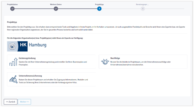 Als nächstes können Sie den Typ Ihres Projekts bestimmen. Sie haben die Wahl zwischen den Projekttypen Existenzgründung, Unternehmenssicherung und Unternehmensnachfolge. Wählen Sie einfach einen der Typen aus und klicken Sie auf "weiter". Danach wird Ihnen angezeigt, welche regionale Industrie- und Handelskammer für Ihr Vorhaben zuständig ist.
